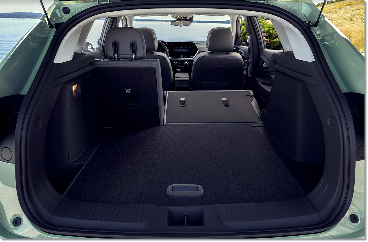 뒷좌석 무릎공간은 트레일블레이저보다 짧은 아쉬운 공간을 보여주고 있지만 전 모델에 비해 7cm 늘어나 여유로운 편이며 미국 판매 형은 중앙 컵홀더가 없는데, 국내에선 어떨지 궁금하네요. 전기 자동차처럼 바닥이 평평하다는 점도 장점으로 볼 수 있겠습니다. 트렁크 용량은 12% 늘어나 약 400리터를 확보해 여유 있는 트렁크 공간을 자랑하고 있습니다.