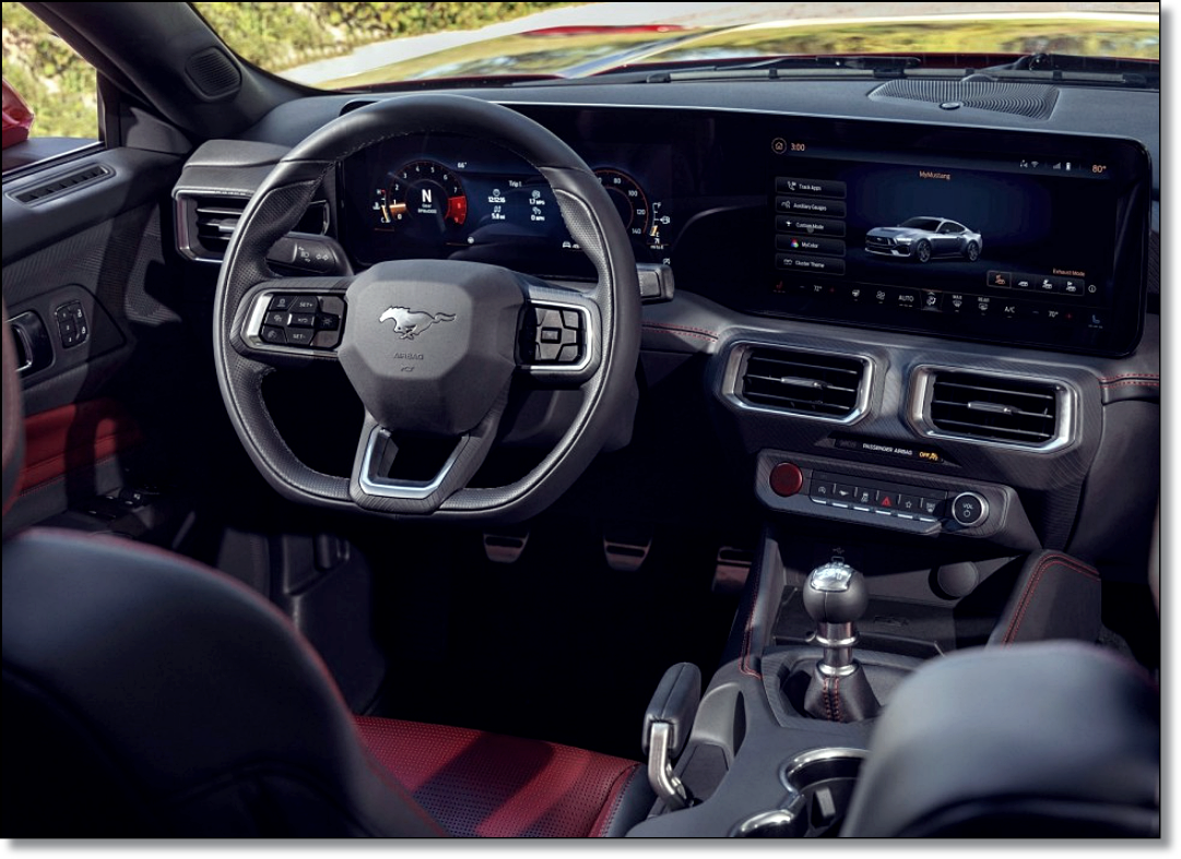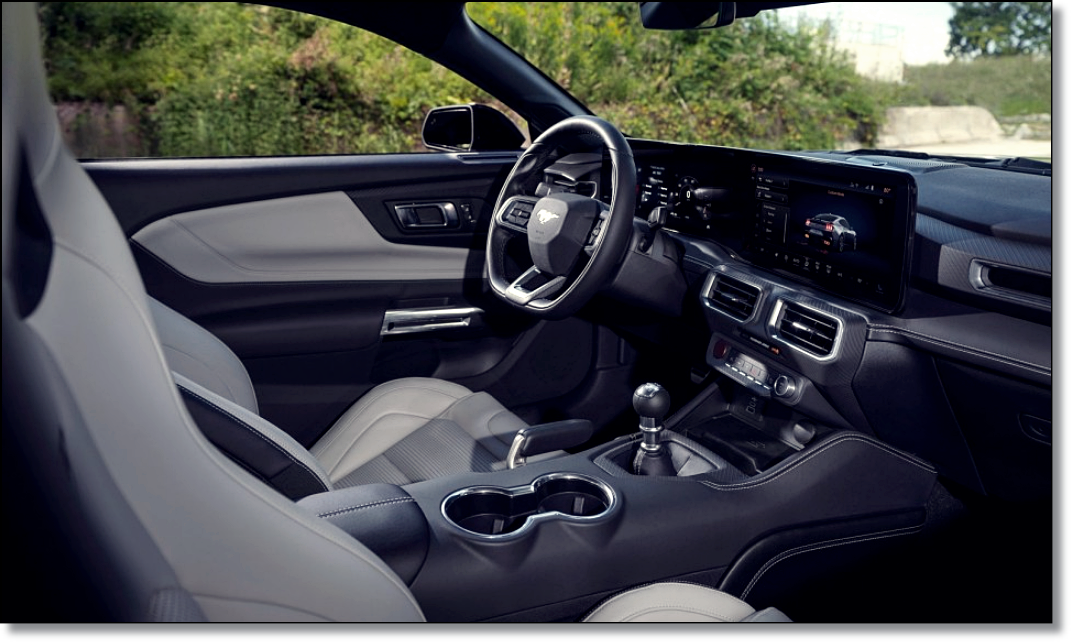 측면부는 전통적인 머스탱의 모습을 그대로 사용했고, 길게 빠진 후드와 짧은 트렁크로 이뤄진 전형적인 머스탱의 모습을 가지고 있죠. 그나마 변한 것이 있다면 기존의 두터운 상하단 캐릭터라인이 제거되고 하나의 펀치 라인만 남아있습니다. 신발이라고 할 수 있는 휠은 브렘보 브레이크가 탑재된 19인치 휠이 적용되었네요. 후면부는 누가 봐도 머스탱이고 GT 모델에선 스포일러가 탑재되며 머스탱 특유의 세 줄 테일램프는 더 작아지고 단순해졌습니다. 이제 실내를 알아볼까요.