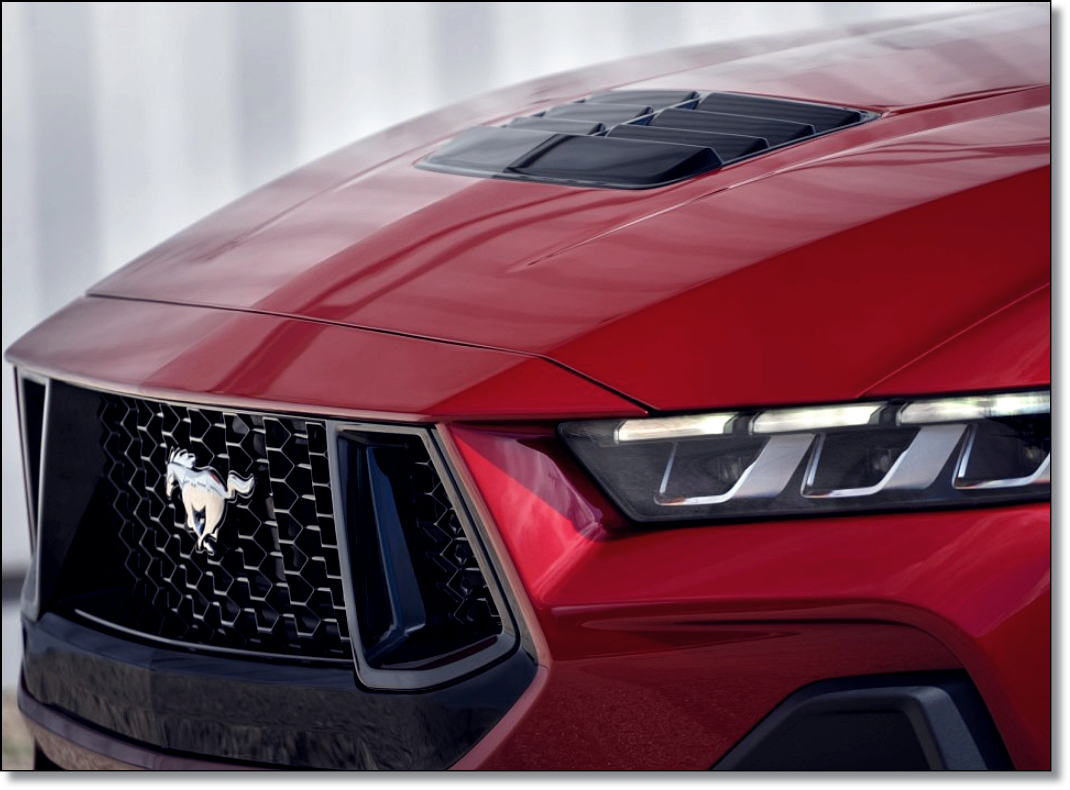 전 모델 대비 전장, 전고가 조금씩 커졌고, 현행모델과 플랫폼이 같기에 똑같은 휠베이스를 보여주고 있죠. 역시 머스탱 특유의 각진 디자인은 계속해서 이어받고 있습니다. 전면부에선 그릴이 조금 더 각지고 커져서 남성미를 자극하는 동시에 오리지널 디자인의 그릴도 재현했네요. 헤드램프는 6세대 초기형과 비슷한 느낌을 가졌으나 현행 디자인에 맞게 얇아져 미래적인 디자인을 내며, 방향지시등과 통합된 3 분할 DRL이 정리정돈 잘 된 디자인을 보여주고 있네요.