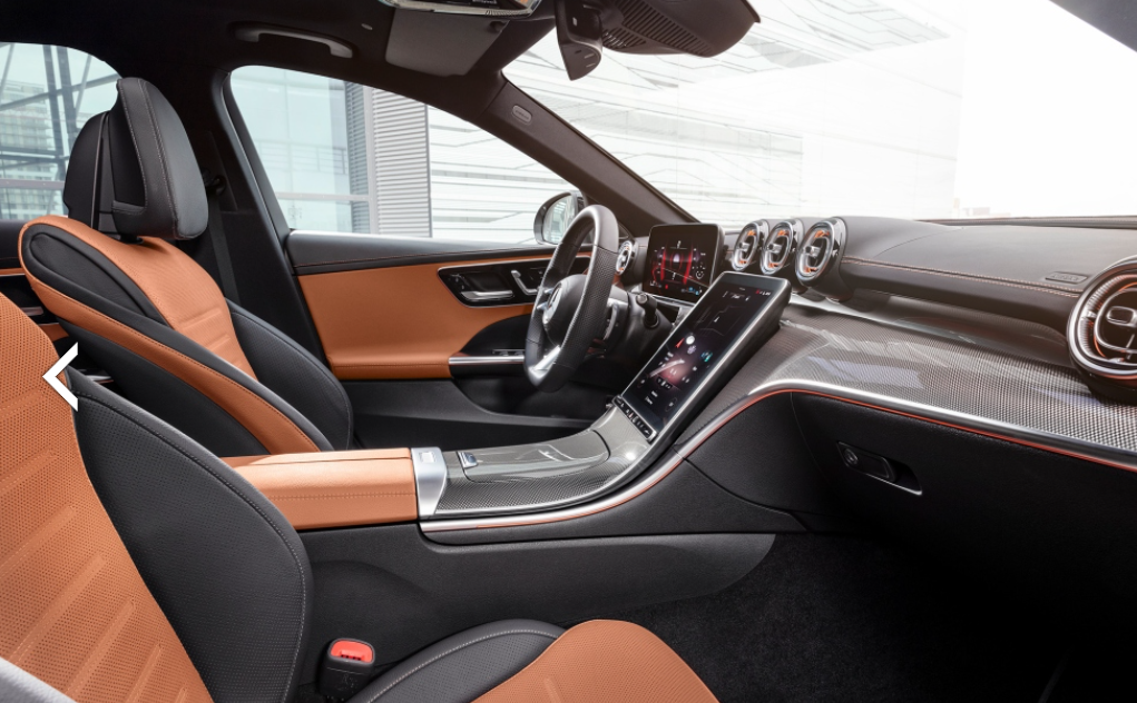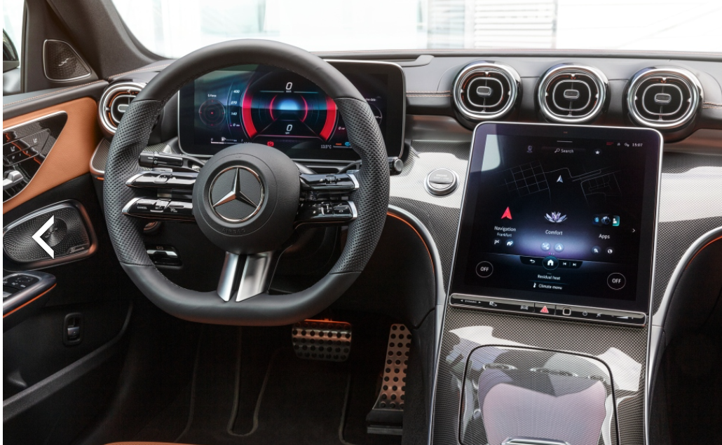 이번 풀체인지 C클래스의 가장 기대되는 인테리어 를 살펴봅시다. 일단 E클래스 벤츠의 새로운 스티어링 휠이 적용이된모습을 확인 할수있다. 새롭게 디자인되어 S클래스,E클래스 에 적용되는 공통된 스티어링 휠 이다. 디스플레이는 12.3인치 풀 디지털 계기판 이 자리잡고있다. 이번 풀체인지의 메인이죠, 센터 페시아에 자리잡고있는 11.9 풀 디스플레이 가 자리잡고 있다. 이번 인테리어의 메인이라고 볼수가있고 센터 디스플레이를 세로로 길게 뻗음으로써 C클래스 의 내부 인테리어 S클래스 처럼 고급스럽게 업그레이드를해준다. 그동안 터치스크린에 힘을 주지않던 벤츠가 한번 터치를 적용하더니 계속해서 적용하는 모습이 인상깊습니다. 새로운 송풍구 디자인도 선보였다. 이디자인은 최초로 C클래스 풀체인지에 추가되는 디자인이다. 기존에 벤츠의 송풍구는 동그라미 였다면 지금은 약간의 타원형이다. 벤츠는 엠비언트 램프 를 잘쓰는 자동차로 많이알려져있습니다. C클래스 풀체인지 또한 아낌없는 엠비언트로 내부의 무드효과 를 극대화로 끌어올려 내부 인테리어는 동종차량 최고의 인테리어 라 자부할수있습니다.