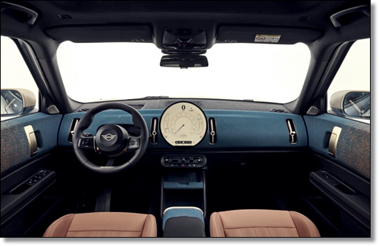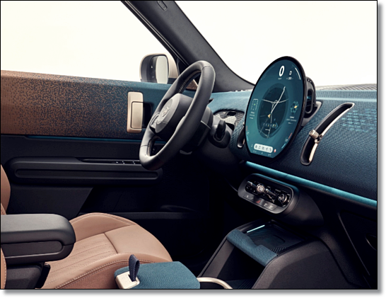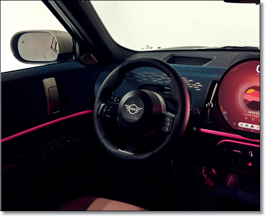가장 중요한 클러스터가 이제 사라지고 모든 차량에 헤드업 디스플레이가 기본으로 제공됩니다. 하지만 역시 미니 실내의 주인공은 원형 OLED 디스플레이인데요. 지름이 9.4인치에 달하는 대형이며 안드로이드 기반 운영체제를 통해 다양한 속도계 그리고 개성 넘치는 테마를 선명하게 보여줍니다.