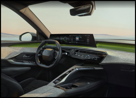 한국 소비자들에게 중요한 실내를 알아보겠습니다. 패브릭 재질을 상당히 사용했으며 파노라믹 아이-콕핏이라 칭해지는 구성을 가졌는데요. SF영화 속 조종석을 보는 듯한 입체감으로 미래적인 디자인을 가졌습니다. 또 스티어링 휠은 면적이 상대적으로 작아 운전자의 시야를 확보했습니다.