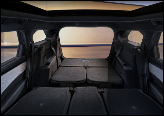 센터 콘솔 역시 입체적으로 튀어나와있는데 드라이브 모드 버튼이나 전자식 파킹 브레이크 버튼 그리고 비상등 버튼도 붙어있습니다. 꽤나 여유로운 2열 공간과 대형 파노마릭 글라스루프가 흥미롭게 다가오는데, 3열까지 제공하는 7인승이며 시트가 풀 플랫 돼 차박도 가능합니다.