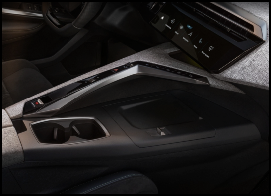 21인치 커브드 디스플레이가 심플하고 사이버틱한 UI를 뽐내고 있고 특이하게도 대시보드에 매달려있는데 그 밑으로 엠비언트 조명이 은은하게 비추고 있어 마치 하늘에 떠있는 듯 보입니다. 센터 패시아에는 메뉴가 나오는 보조 디스플레이를 장착했으며 그 좌측은 작게 기어노브와 시동버튼이 보입니다.